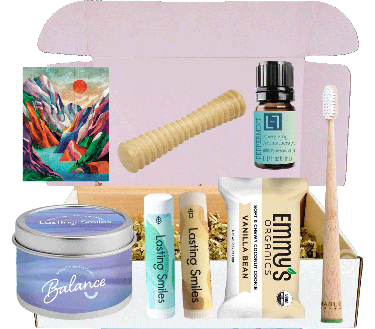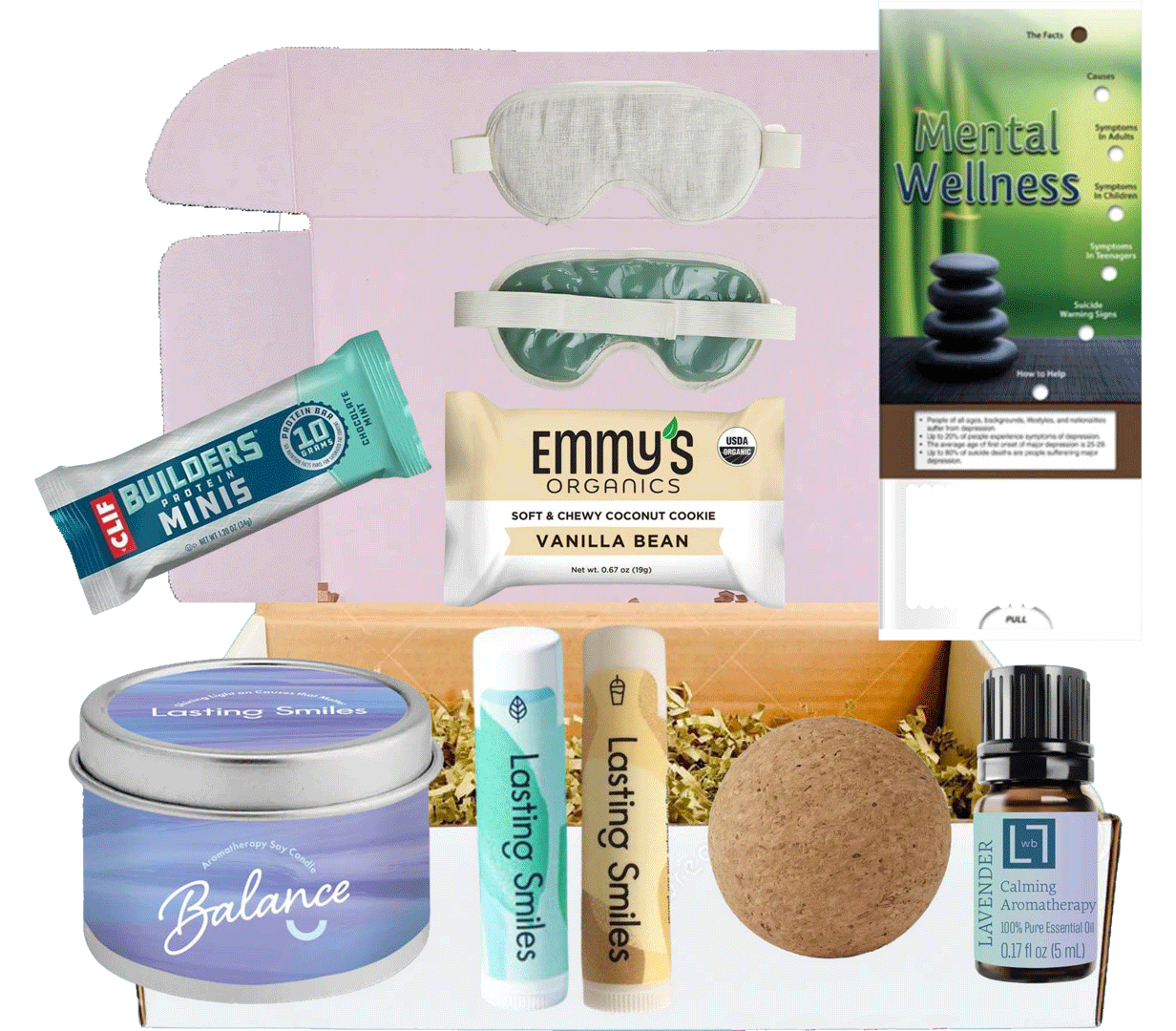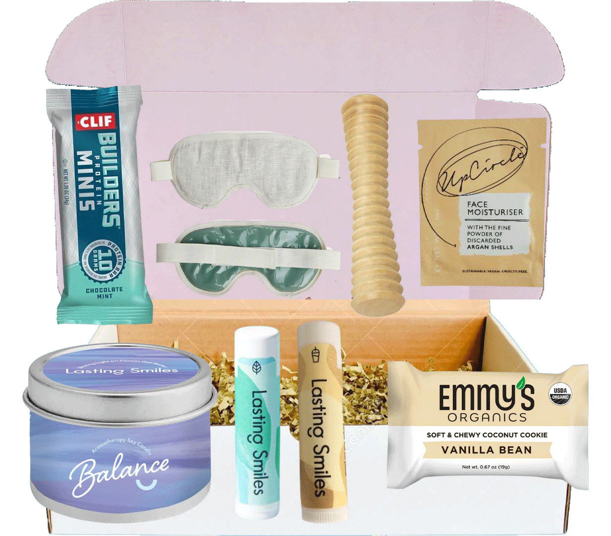 Includes Nine on-trend wellness products pictured here: Yes nutrition bar, Linen cooling eye mask filled with natural green clay, Lasting Smiles Balance Soy Candle, Lasting Smiles Lip Balm(2), Emmy's organics cookie, Bamboo foot massage roller, Asheville tea company packet, and the good patch.
