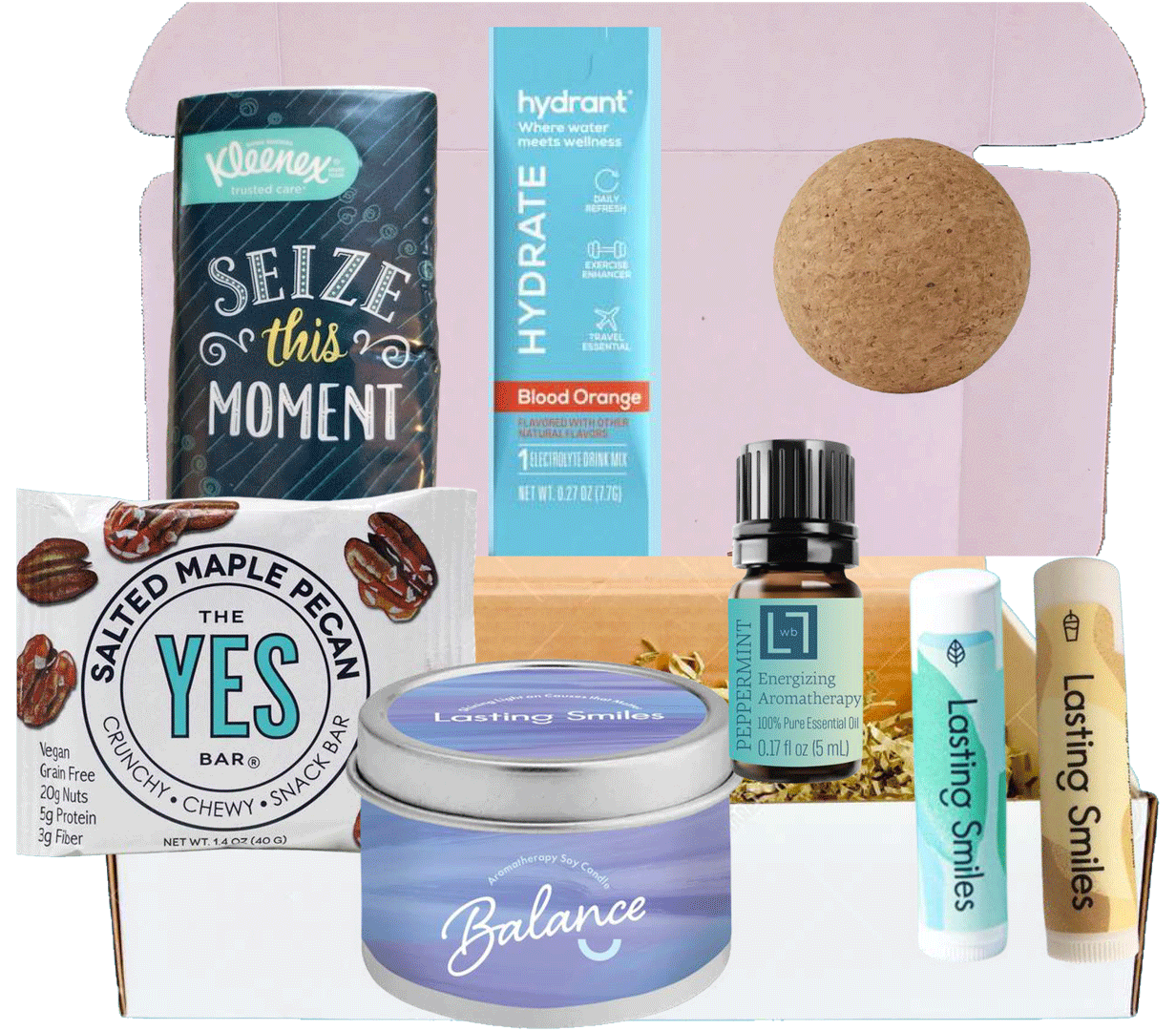 Includes Nine on-trend wellness products: Breakfast Blend organic protein powder, Hand sanitizer with carabiner, Travel pack of Kleenex, Hydrant Immunity powder, Bamboo foot massage roller, Lasting Smiles Balance Soy Candle, Lasting Smiles Lip Balm(2) and Essential Oil.