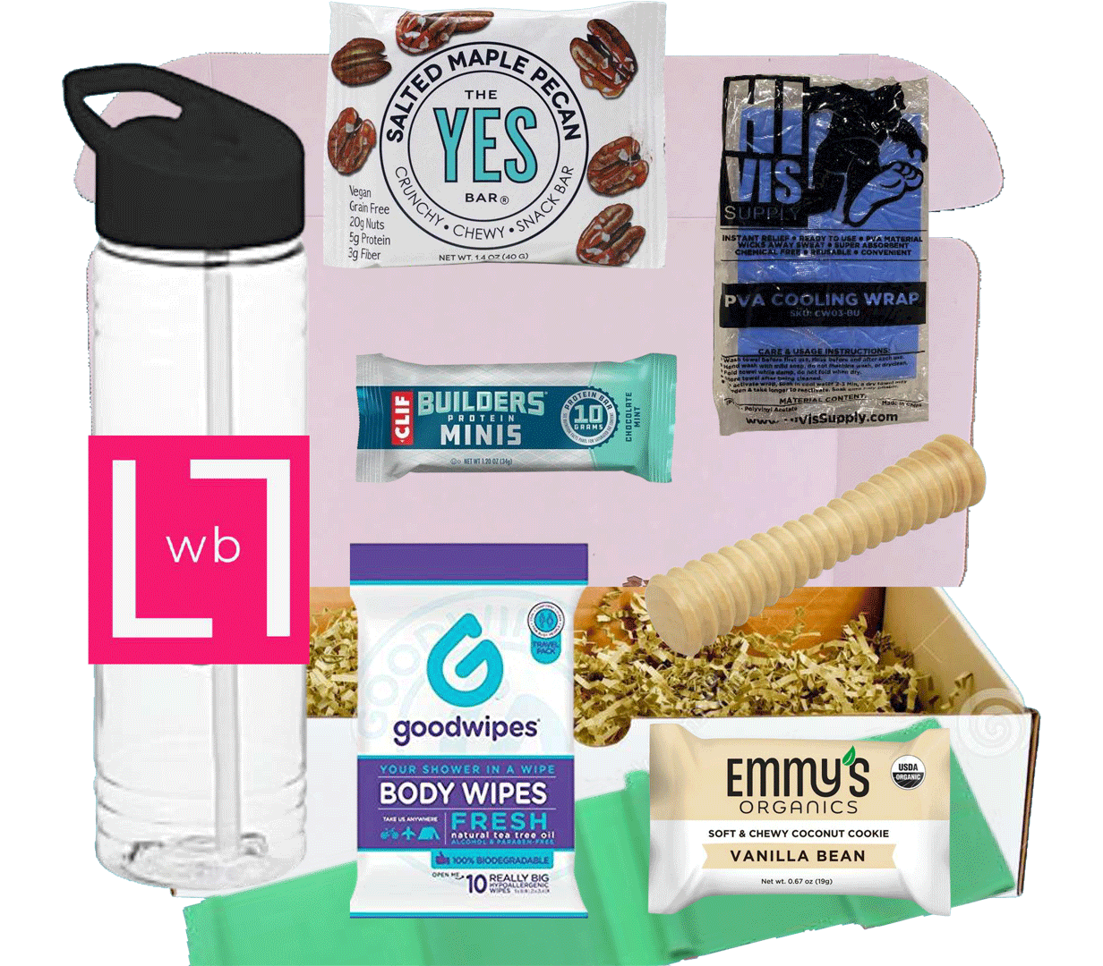 Includes eight on-trend wellness products pictured here: Clear Impact Halcyon Water Bottle with Flip ,Straw - 24 ounces, Breakfast blend protein powder ,Post workout body wipe, Single cooling workout towel Elastic stretch exercise band, Hydrant Electrolyte Single Stick, Yes bar, Bamboo foot roller